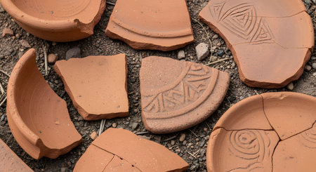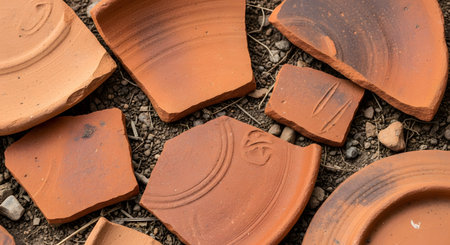 Several broken shards of ancient terracotta pottery are scattered on the ground at an archaeological site. The fragments of earthenware, some with decorative patterns, represent history, archaeology, and the discovery of past civilizations.