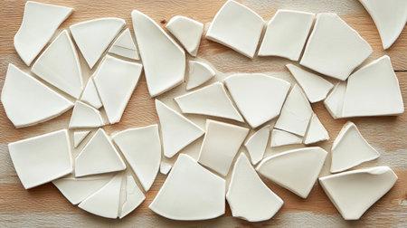 This image features an intricate arrangement of white ceramic fragments scattered on a wooden surface. Each piece displays distinct cracks, highlighting the beauty in imperfection.