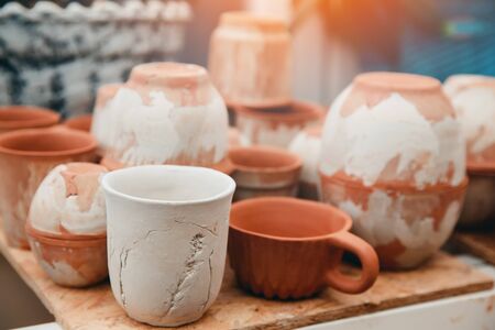 Making ceramic pots and cups from white clay handmade. Small family factory in Turkey
