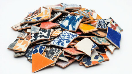 This image features a vibrant assortment of broken ceramic tiles displaying unique patterns and textures, perfect for design projects, decor crafts, and artistic inspiration.