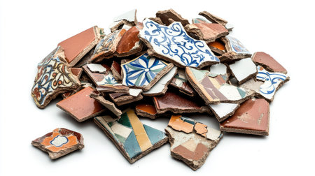 A captivating collection of colorful broken ceramic tiles arranged chaotically on a white surface, creating an intriguing abstract composition ideal for artistic backgrounds.