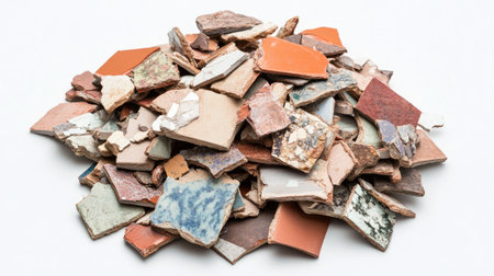 A vibrant assortment of broken ceramic pieces and tile fragments showcasing a range of colors, textures, and patterns. Perfect for artistic inspiration or renovation projects.