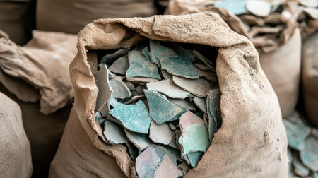 This image showcases a variety of broken ceramic pieces with unique textures and colors, ideal for projects that require artistic inspiration or creative design elements.