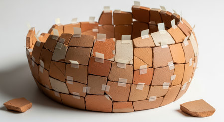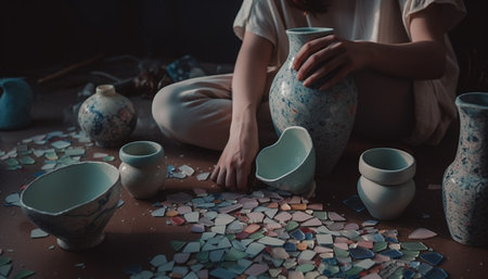 Hands Assembling Broken Pottery Pieces with Glue Tools