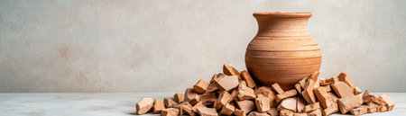 This abstract image portrays a broken terracotta vase, a visual lament for loss and life's impermanence Scattered fragments below the intact vessel evoke reflection on time and transition The artwork captures vulnerability and decay, offering a contemplative study of fragility and resilience It is a poignant meditation on life's transient AI Generative