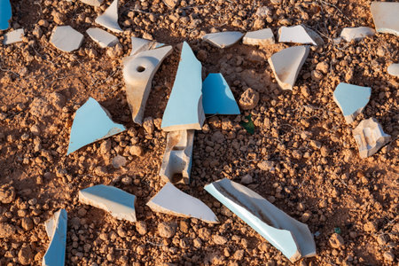 Ceramic light blue and white tiles broken into small sharp pieces, thrown on the volcanic soil in the nature. Lanzarote, Canary Islands, Spain.