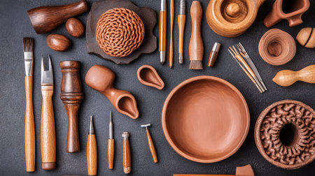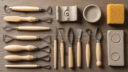 Various sculpting tools are spread out on a surface with clay and materials ready for creating art. The scene shows a workspace for artists.