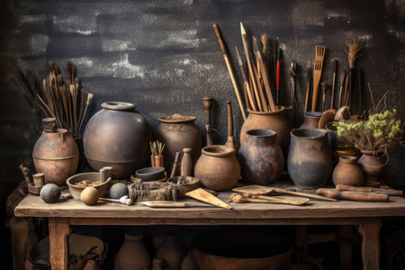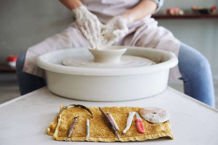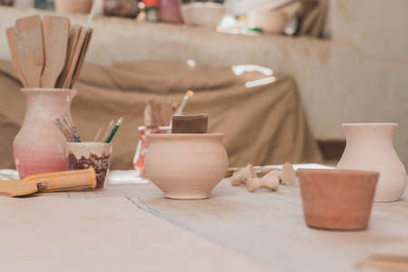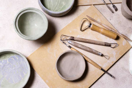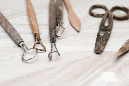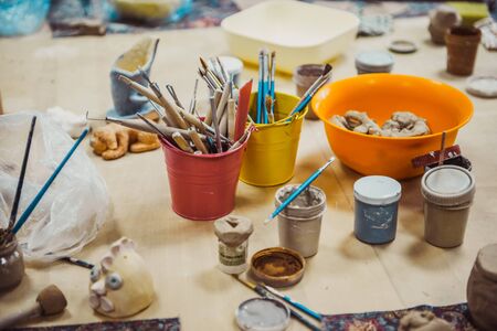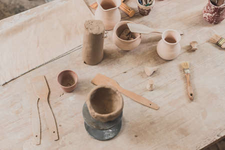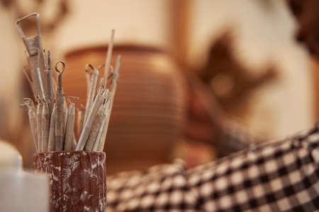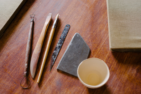 Tools in a creative lab to work handmade clay and modeling to create home made jars and works of art. Concept of: handcraft, tradition, handmade artwork, creativity.