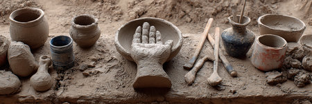 Explore a vibrant artisan workspace filled with tools, clay pieces, and natural materials. This creative environment showcases the artistic process of pottery and sculpting.