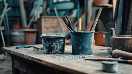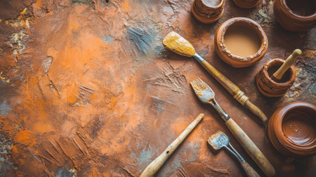 A close-up view of rustic crafting tools such as brushes and clay pots set on an earthy textured surface, perfect for artistic and creative projects.