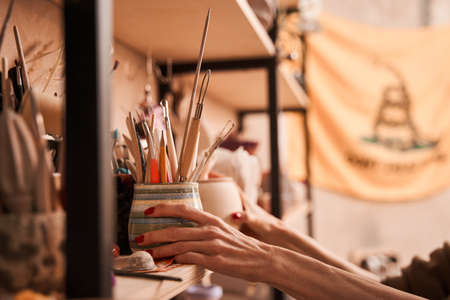 Hands of young female creative artisan holding bunch of wooden handtools for carving ornamental patterns on clay items