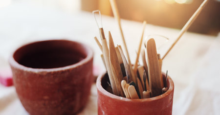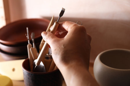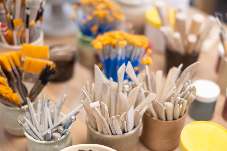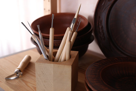 Tools on pottery studio table, shallow debt of field, small art business concept