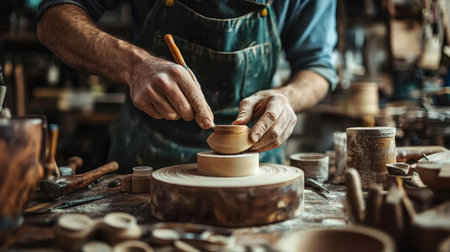 Potter working with clay pottery in artisan workshop