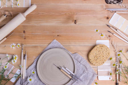 Above view of various tools for pottery on table in workshop. Handicraft, creativity, hobby and activity concept.