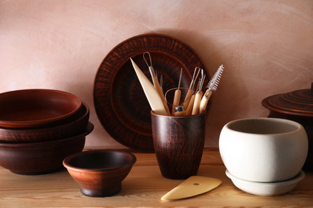 Set of different crafting tools and clay dishes on wooden table in workshop, closeup
