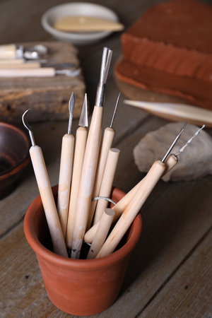 Tools for forming clay on wooden background.