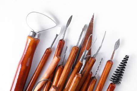 Closeup of set of craft scalpting tools for working with clay lying on wooden table