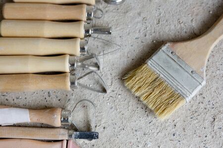 Tools for creating a bas-relief and a paint brush on a concrete background