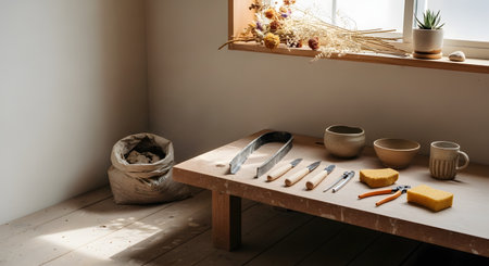 A clean and organized pottery workbench featuring various sculpting tools, sponges, and a bag of clay. Soft natural light streams in through a window decorated with dried flowers, highlighting the artistic tools laid out on a wooden table.