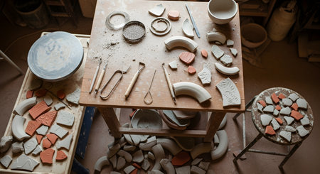 A messy potter's table covered in dried clay shards, carving tools, and unfinished ceramic pieces. The top-down view captures the creative and raw process of handmade pottery in a studio.