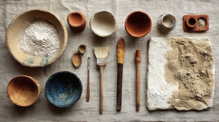 A visually appealing arrangement of pottery bowls and artisanal tools on a natural fabric background, showcasing the beauty of handmade craftsmanship.