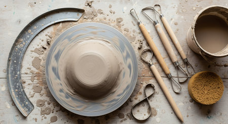 Overhead shot featuring pottery wheel with clay, tools, and bucket in art studio. Represents craftsmanship, handmade art, and ceramic creations.