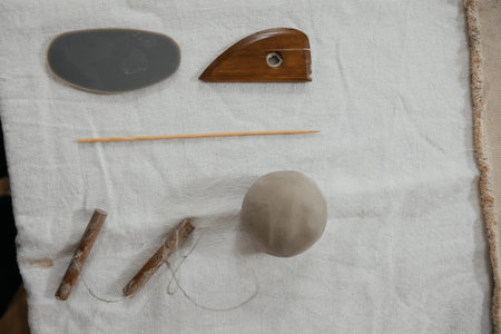 Pottery tools, wooden modeling tools, a clay bowl, and a stone arranged on linen cloth, creating a pottery crafting scene