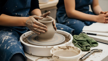Hands skillfully shape a clay pot in a pottery studio