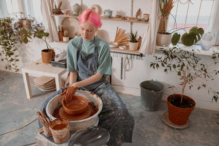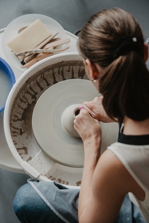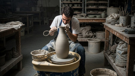 Potter working on a pottery wheel in a pottery workshop