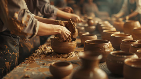 A close-up shot captures the hands of a craftsperson shaping wet clay into a pot on a pottery wheel. Surrounding them are various partially finished clay pots, showcasing the process of traditional pottery making. The workshops atmosphere is filled with a sense of focus and dedication.