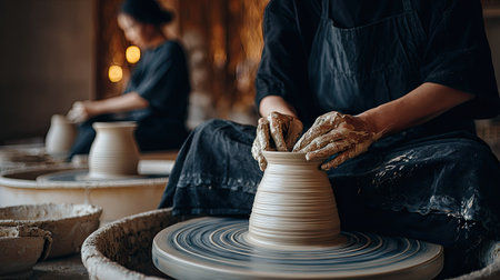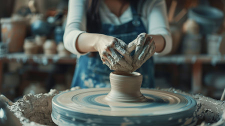Artisan hands meticulously shaping a clay pot on a spinning pottery wheel. craftsmanship, creativity, and traditional art form are highlighted.