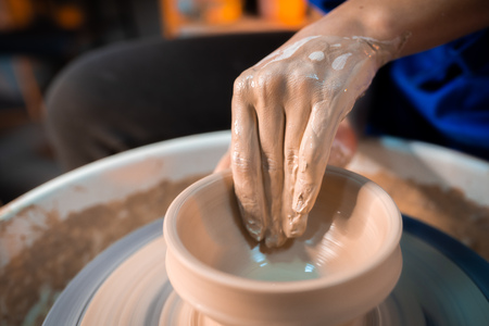 Hands working on a spinning pottery wheel, making pottery out of clay mud. close up photograph with a shallow depth of field.