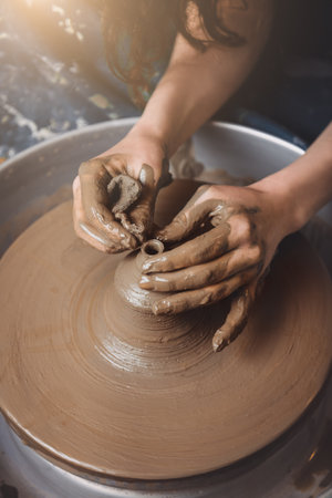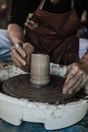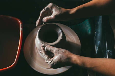 Master skulpting a clay pot, potter hands, crafting concept