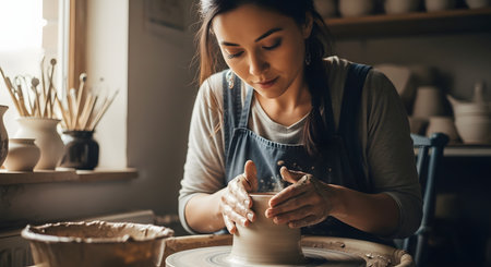 A focused woman potter, wearing an apron, concentrates on shaping a piece of wet clay on a spinning pottery wheel. Her hands are covered in clay as she skillfully forms a vase or pot in a rustic, sunlit art studio.
