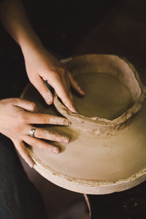 Work in a pottery workshop, womans hands creating ceramics.
