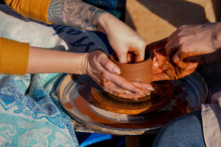 Making a handmade clay pot. Pottery lesson, hobby.