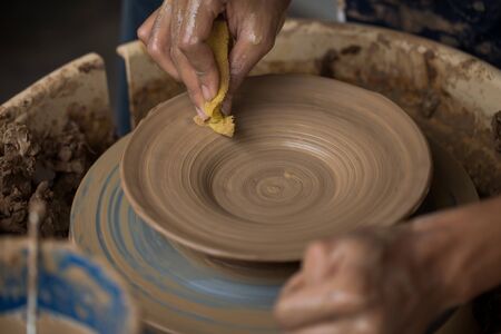Hands of craftsman artist working on pottery wheel.Selective Focus