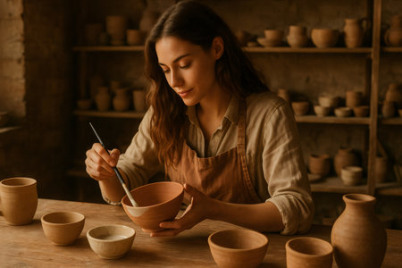 Young woman painting ceramic bowl with brush in pottery workshop, surrounded by handmade pottery