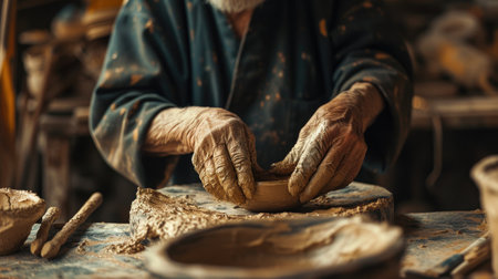 Artisan Shaping Clay Bowl Hands of a Potter in Rustic Workshop Ambience.