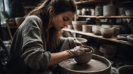 Female artisan crafting ceramic pottery in rustic workshop. That the image is generated using AI.