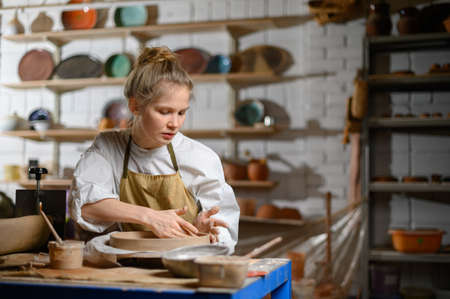A ceramist makes a plate out of clay A woman in an apron works in a pottery workshop.