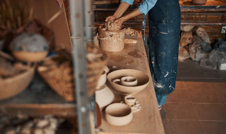 Skillful potter working with clay in workroom