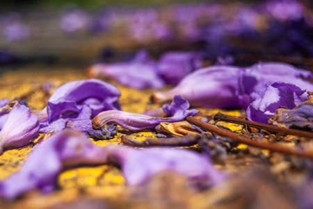 Close-up of the fallen purple jacaranda flowers on yellow road marking - Macro, Selective focus