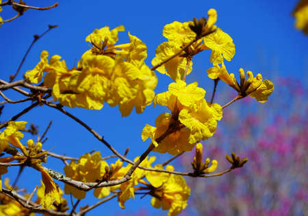 Bright cluster of yellow flowering tree of Tabebuia Aurea