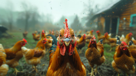 a lot of chickens waiting to be fed up, they are looking at the viewer. Neural network generated in May 2023. Not based on any actual scene or pattern.