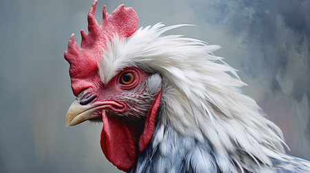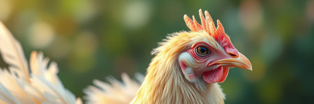 Vibrant close-up of rooster's head with detailed feathers and comb in focus. That the image is generated using AI.