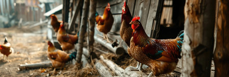 horizontal banner, a flock of roosters and chickens on the background of a chicken coop, the concept of farming and organic products, healthy food, sunny day