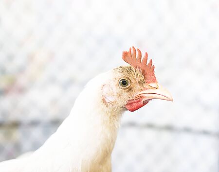 White chicken portrait closeup outdoors. Young hen in the village. Concept of farming and rural life