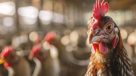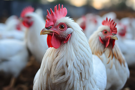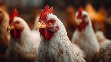 White chickens gather in a barn, highlighting their features and the rustic atmosphere of a bustling egg production farm.