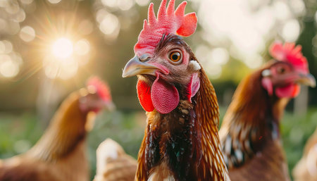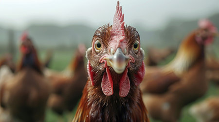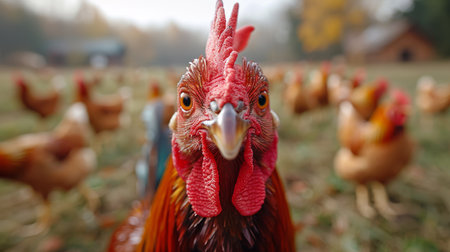 A vibrant rooster stands in focus with blurred chickens in the background, capturing rural life and farm atmosphere in a countryside environment.